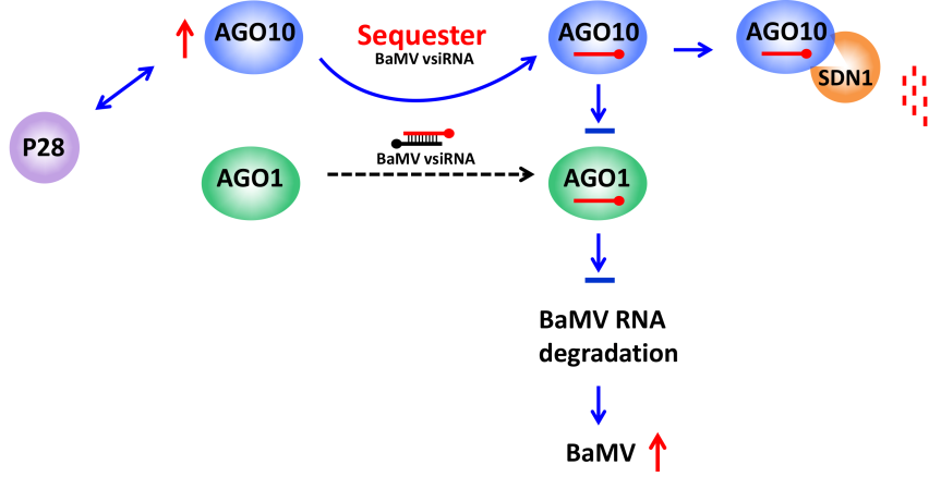 Within BaMV infection, RNA-silencing suppressor (P28) upregulates the gene expression of NbAGO10, which competes with antivirally active NbAGO1 for binding BaMV vsiRNA. This study provides the evidence that virus hijacks AGO10-directed suppression of AGO1-mediated antiviral silencing to assist virus invasion, which represents a novel strategy to counteract antiviral RNA silencing.