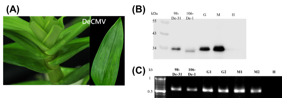 Dendrobium chlorotic mosaic virus causing (A) chlorotic and mosaic symptoms in dendrobium, (B) serological detection technology and (C) nucleic acid detection technology.