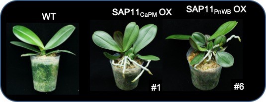 Orchids can be classified into two categories: monopodial and sympodial plants. This project establishes an orchid transformation system which help us to generate branching phenotype in monopodial orchid using SAP11 protein. The branching shoots caused by SAP11-mediated degradation of plant transcription factors can strengthen the growth potential and polymorphism of Phalaenopsis.