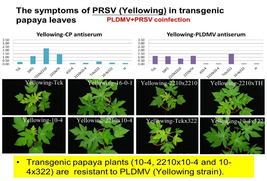 具優良園藝性狀之雙抗台農二號木瓜(2210X10-4 &10-4x322 ),經接種PRSV 及 PLDMV後一個月不會發病,以此二種病毒的 抗血清檢測,臆測不到病毒的累積,此為全世界之首例。