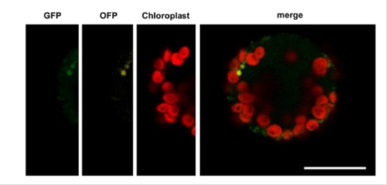 Autophagy (橘色螢光標記)與病毒核酸 (綠色螢光標記)共定位於葉綠體周邊。