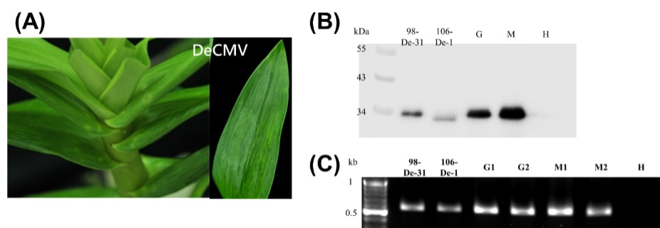 石斛蘭褪綠嵌紋病毒(A)於石斛蘭引起之病徵,以及病毒之(B)血清學檢測技術平台與(C)核酸檢測技術平台。