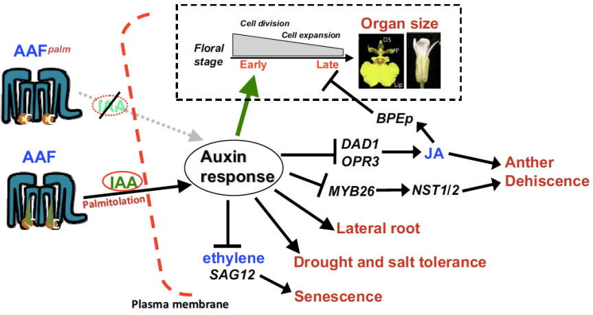 我們發現文心蘭和蝴蝶蘭中的tetraspanin基因AAF為調控蘭花花朵大小之關鍵基因。研究發現蘭花AAF同源基因的表現越高,花被器官的大小越大。AAF同源基因是透過提高植物生長素(auxin)的反應效率及隨後抑制植物的茉莉酸來調控花器官的大小。