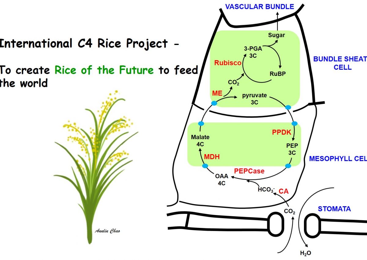水稻進行C3型光合作用,利用太陽能將二氧化碳(CO2)轉化成穀粒中碳水化合物的效率不如C4型光合作用,因此產量不如C4型作物(例如玉米)。將水稻由C3型改造成C4型作物對維持全球糧食安全非常重要,因為水稻被廣大種植於玉米所無法種植的地區,而且是全球超過50%人口主要的糧食。