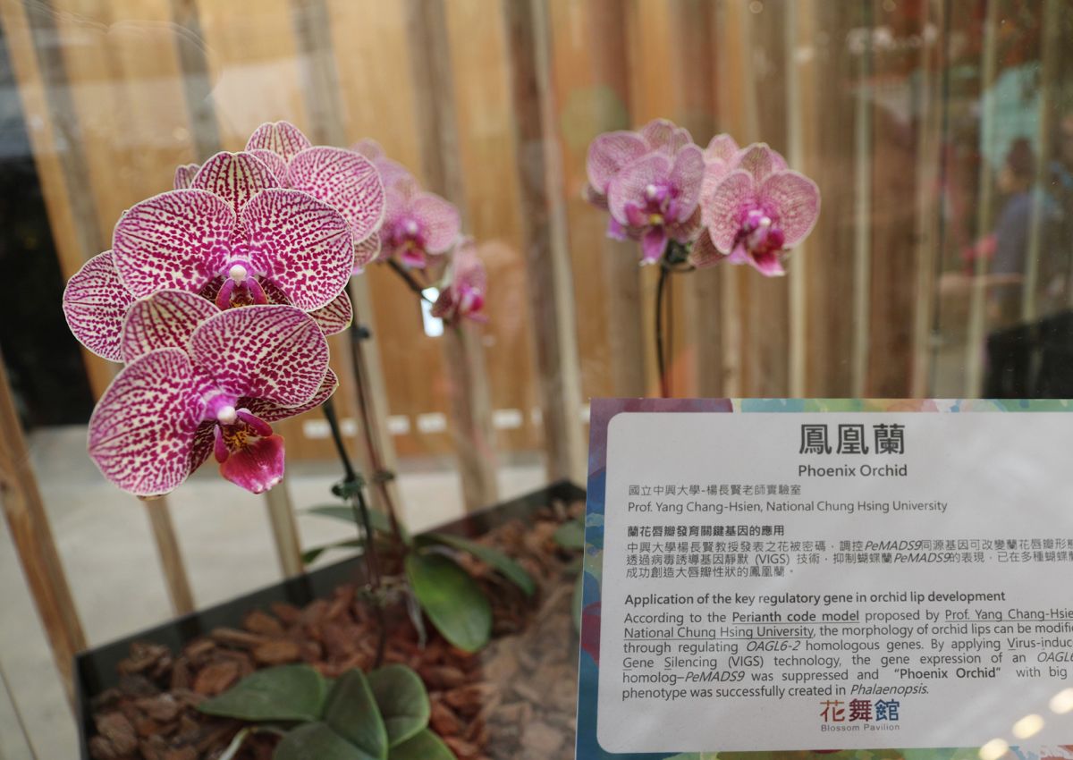興大學術副校長暨生技所講座教授楊長賢為國際知名的蘭花學者,其解析蘭花特有花型發育機制,改良本土蘭花,透過病毒誘導基因靜默技術,抑制蝴蝶蘭PeMADS9的表現,已在多種蝴蝶蘭成功創造大唇瓣性狀的「鳳凰蘭」。純白及粉斑兩款特殊新穎的鳳凰蘭,在花博后里園區花舞館蘭花廳展示,特殊的花型及雅緻的花姿吸引許多民眾駐足拍照討論。